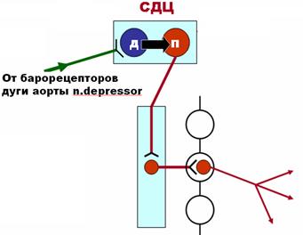 В остром опыте у кролика регистрируют давление в сонной артерии прямым методом. При раздражении периферического отрезка перерезанного блуждающего нерва сразу же происходит резкое снижение АД, связанное с остановкой сердца. При раздражении центрального отрезка перерезанного депрессорного нерва снижение АД происходит не сразу, развивается постепенно, не достигает слишком низкого уровня. В этом случае причиной изменения АД является расширение сосудов, вызванное уменьшением сосудистого тонуса.