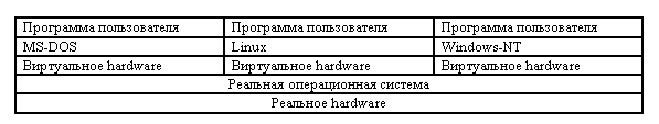 В начале лекции мы говорили о взгляде на операционную систему как на виртуальную машину, когда пользователю нет необходимости знать детали внутреннего устройства компьютера. Он работает с файлами, а не с магнитными головками и двигателем; он работает с огромной виртуальной, а не ограниченной реальной оперативной памятью; его мало волнует, единственный он на машине пользователь или нет. Рассмотрим несколько другой подход. Пусть операционная система реализует виртуальную машину для каждого пользователя, но, не упрощая ему жизнь, а, наоборот, усложняя. Каждая такая виртуальная машина предстает перед пользователем как абсолютно голое железо копия всего hardware в вычислительной системе, включая процессор, привилегированные и непривилегированные команды, устройства ввода-вывода, прерывания и т.д. И он один на один с этим железом. При попытке обратиться к этому виртуальному железу на уровне привилегированных команд, в действительности происходит системный вызов реальной операционной системы, которая и производит все необходимые действия. Такой подход позволяет каждому пользователю загрузить свою собственную операционную систему на виртуальную машину и делать с ней все, что душа пожелает.