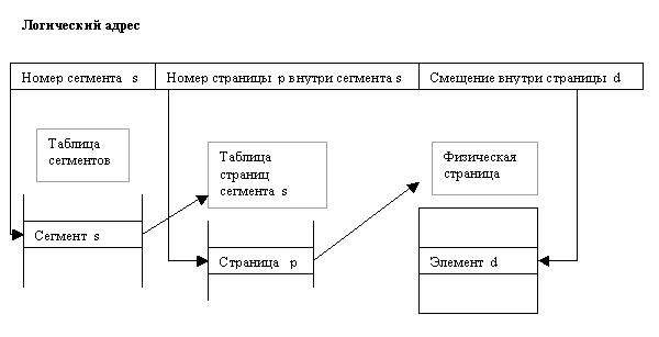 Хранение в памяти сегментов большого размера может оказаться неудобным. Возникает идея их пейджинга. При сегментно-страничной организации виртуальной памяти происходит двухуровневая трансляция виртуального адреса в физический. В этом случае виртуальный адрес состоит из трех полей: номера сегмента виртуальной памяти, номера страницы внутри сегмента и смещения внутри страницы. Соответственно, используются две таблицы отображения - таблица сегментов, связывающая номер сегмента с таблицей страниц, и отдельная таблица страниц для каждого сегмента.