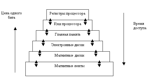 Рассмотренная нами схема трехуровневой памяти (ассоциативная, основная, вторичная) является частным случаем многоуровневой памяти. Например, как показано на рис. 9.5, разновидности памяти могут быть организованы в иерархию по убыванию скорости доступа и возрастанию цены.