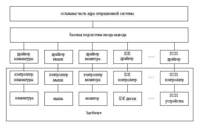 Два нижних уровня этой слоеной системы составляет hardware: сами устройства, непосредственно выполняющие операции, и их контроллеры, служащие для организации совместной работы устройств и остальной вычислительной системы. Следующий уровень составляют драйвера устройств ввода-вывода, скрывающие от разработчиков операционных систем особенности функционирования конкретных приборов и обеспечивающие четко определенный интерфейс между hardware и вышележащим уровнем – уровнем базовой подсистемы ввода-вывода, которая, в свою очередь, предоставляет механизм взаимодействия между драйверами и программной частью вычислительной системы в целом.
