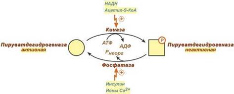 Регулируемымферментом ПВК-дегидрогеназного комплекса является первый фермент – пируватдегидрогеназа (Е1). Два вспомогательных фермента – киназа и фосфатаза обеспечивают регуляцию активности пируватдегидрогеназы путем ее фосфорилирования и дефосфорилирования. Вспомогательный фермент киназа активируется при избытке конечного продукта биологического окисления АТФ и продуктов ПВК-дегидрогеназного комплекса – НАДН и ацетил-S-КоА. Активная киназа фосфорилирует пируватдегидрогеназу, инактивируя ее, в результате первая реакция процесса останавливается. Фермент фосфатаза, активируясь ионами кальция или инсулином, отщепляет фосфат и активирует пируватдегидрогеназу. Таким образом, работа пируватдегидрогеназы подавляется при избытке в митохондрии (в клетке) АТФ и НАДН, что позволяет снизить окисление пирувата и, следовательно, глюкозы в случае когда энергии достаточно. Если АТФ мало или имеется влияние инсулина, то образуется ацетил-SКоА. Последний в зависимости от условий будет направляться либо в цикл трикарбоновых кислот с образованием энергии АТФ, либо на синтез холестерина и жирных кислот.