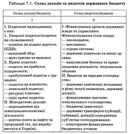 У цілому склад доходів та видатків Державного бюджету України можна подати в такому вигляді (табл. 7.1).