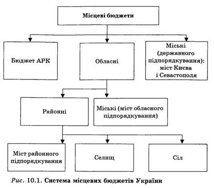 До місцевих належать обласні, районні, міські, селищні та сільські бюджети (рис. 10.1). Це фонди фінансових ресурсів, що перебувають у розпорядженні місцевих рад народних депутатів та органів місцевого й регіонального самоврядування. Усього місцевих бюджетів в Україні близько 12 тис.