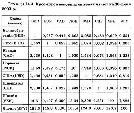 Відомості про крос-курси основних світових валют звичайно публікують у такому вигляді (табл. 14.4).