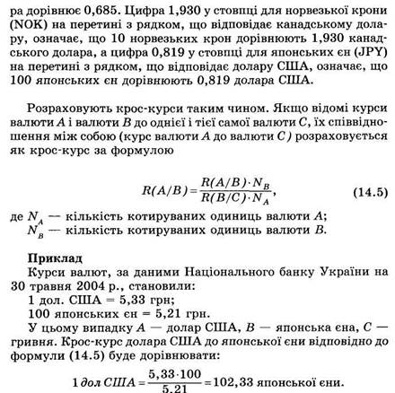 У вертикальних стовпцях табл. 14.4 дається пряме котирування відповідної валюти. У діагональних елементах вказується, скільки одиниць певної валюти котирується (10 норвезьких крон, 10 шведських крон, 100 японських єн, 1 одиниця решти валют). Для долара США як основної світової валюти наведено курси купівлі та продажу. Так, співвідношення між доларом США і фунтом стерлінгів 0,685 означає, що курс купівлі дола-