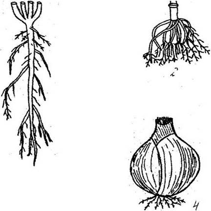 Рис.10. Подземные органы растений: 1 - стержневая корневая система; 2 – мочковатая корневая система; 3 - корневище; 4 - луковица.