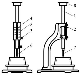 | Рис. 2. Схема приладу Віка: а – загальний вигляд; б – пестик; в – голка; г – кільце до приладу 1 – металічний стрижень; 2 – обіймач станини; 3 – стопорний пристрій; 4 – покажчик; 5 – шкала; 6 – пестик; 7 – голка; 8 – додатковий вантаж |