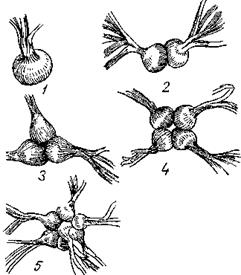 Способность лука на одном донце формировать разное число луковиц носит название «гнездности». Различают одно-, двух-, трех- и многогнездные луки (рис. 23).