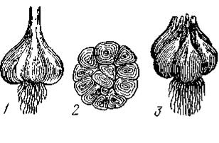 | Рис. 24 - Чеснок: 1 - нормально развитый озимый чеснок; 2 - поперечный разрез луковиц чеснока; 3 - переспелый чеснок (частозубка). | Рис. 25 -. Соцветия и бульбочки чеснока: | |