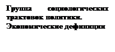 Социологические определения политики, основываясь на социологическом подходе, характеризуют ее через другие общественные явления: экономику, социальные группы, право, мораль, культуру, религию. В соответствии с отражаемой сферой общества их можно подразделить на экономические, стратификационные (социальные), правовые, этические (нормативные) и т.д.