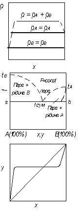 Приймаючи сталим тиск над сумішшю (р = const), зображають на площині залежність температур кипіння рідини і концентрації пари від складів рідкої і парової фаз (діаграма t – х – у). Так самоза р = const і t = const знаходятьзалежність між рівноважними складами фаз, яка зображається діаграмою рівноваги (діаграма у – х).