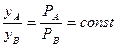 Водночас відповідно до закону Дальтона (за умови застосовності до пари кожного з компонентів рівняння Менделєєва–Клапейрона), парціальний тиск рА заданого компонента А пропорційний до його мольної частки уА в парі: