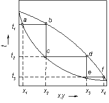 На фазову діаграму у – х (рис. 3.3) наносять лінію рівноваги, що виражає залежність між рівноважними складами (за низькокиплячим компонентом) рідкої (