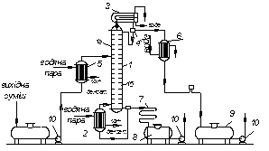 2 – кип’ятильник; 3 – дефлегматор; 4 – дільник флегми; 5 – підігрівач початкової суміші; 6 – холодильник дистиляту або холодильник-конденсатор; 7 – холодильник залишку (або нижнього продукту); 8, 9 – збірники; 10 – насоси