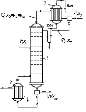 Припустимо, згідно до схеми на рис. 3.16, в колону надходить F кмоль вихідної суміші, склад якої xF мол. часток НК. Згори з колони видаляється G кмоль пари, створюючої після конденсації флегму і дистилят. Кількість одержуваного дистиляту Р кмоль, його склад хР мол. часток НК. На зрошування колони повертається флегма в кількості Ф кмоль, причому її склад дорівнює складу дистиляту (хФ = хР мол. часток). Знизу з колони видаляється W кмоль залишку складу xW мол. часток НК.