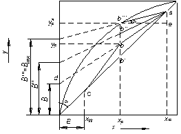 – yF і зображається відрізком b///b. Із зменшенням R точка b зміщується по вертикалі, що відповідає абсцисі точки, яка відповідає складу xF, і рушійна сила знижується доти, поки не перетвориться на нуль (точка b/// ). При цьому робоча лінія аb/// відтинає на осі ординат максимальний відрізок В/// = Bmax, якому за заданого хР відповідає мінімальне флегмове число Rmin: