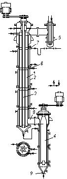 | Рис. 3.24. Схема роторно-плівкової ректифікаційної колони: 1 – колона; 2 – оболонка для обігрівання; 3 – ротор; 4 – роторний випарник; 5 – конденсатор-дефлегматор; 6 – штуцер для надходження вихідної суміші; 7 – штуцер для надходження флегми; 8 – штуцер для надходження пари; 9 – штуцер для виведення залишку |