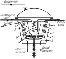 6 – охолоджуваний змійовик; 7 – піддон для збору дистиляту; 8 – кільцевий жолоб
