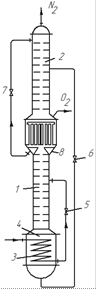 Установки одинарної ректифікації. Стиснене в компресорі повітря після очищення від пилу, двоокису вуглецю і водяної пари надходить в теплообмінник 1 (рис. 3.31), де охолоджується продуктами ректифікації (киснем і азотом). Потім повітря надходить в змійовик кип’ятильника 2 колони, девін частково конденсується, віддаючи тепло рідкому кисню, що кипить ззовні змійовика. Пара практично чистого кисню відводиться з кип’ятильника в теплообмінник 1.