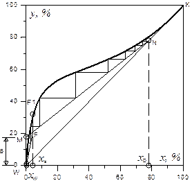 За у–х-діаграмою (рис. ІІІ.18) визначаємо теоретичну кількість тарілок (ступенів зміни концентрації). Для цього будуємо ступінчасту лінію, що складається із горизонтальних і вертикальних відрізків, у межах зміни х від