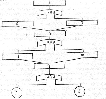 На схеме кругами обозначены исходные события с достаточными данными для свершения, а события, вводимые логическим элементом «ИЛИ» — прямоугольниками. Вследствие выхода параметров за критические величины 1 или механического износа, коррозии 2 происходит взрыв в аппаратуре В, который является причиной для выброса продуктов из аппаратуры в виде парогазового состояния П и жидкого состояния Ж, что приводит к образованию ударной волны и формированию токсичного облака 0, что является причиной разрушения зданий, сооружений Р, заражения людей З, т. е. к аварии А.