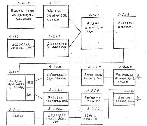 Анализ аварийных ситуаций начинается с рассмотрения положения, при котором имеет место выход параметров за критические значения и повреждения аппаратуры за счет коррозийного и механического износа. После этого в соответствии с кодом, последовательностью, указанными в блок-схеме, анализируются возникающие ситуации, приводящие к чрезвычайным, сопровождающиеся взрывами, разрушениями зданий, коммуникаций, с травмированием людей и токсическим поражением не только обслуживающего персонала, но и с выходом зараженного облака за пределы цеха, производства — уровень Б.и за пределы территории предприятия — уровень В.