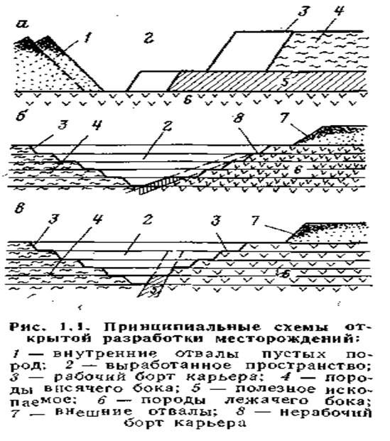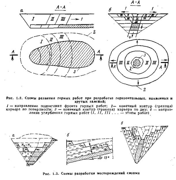 При разработке горизонтальных или пологих залежей удаляют только покрывающие вскрышные породы (рис. 1.1, а); породы лежачего бока (почвы) не извлекаются.