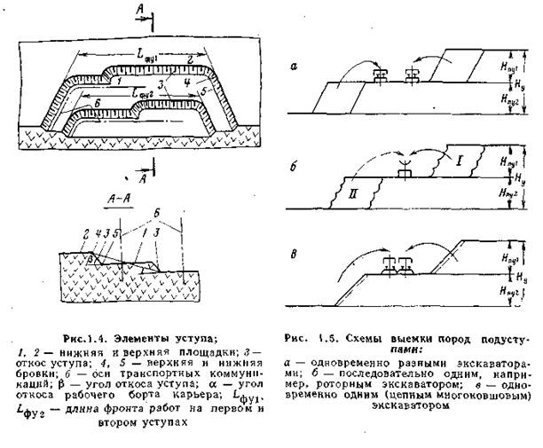 По условию технологии выемки уступы могут разделяться на подуступы (рис. 1.5), разработка которых ведется одним и тем же или разным выемочным оборудованием последовательно или одновременно, но обязательно на единый для уступа транспортный путь.