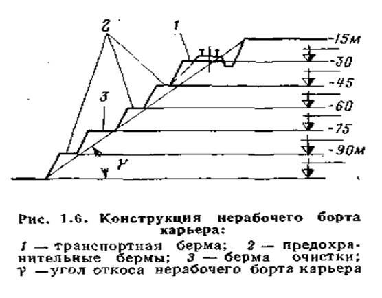 На нерабочих бортах карьера горные работы не производятся, и откосы уступов разделяются площадками (бермами). Различают транспортные и предохранительные бермы и бермы очистки (рис. 1.6). Они формируются при подходе рабочих уступов к конечным контурам карьера за счет уменьшения ширины рабочих площадок.