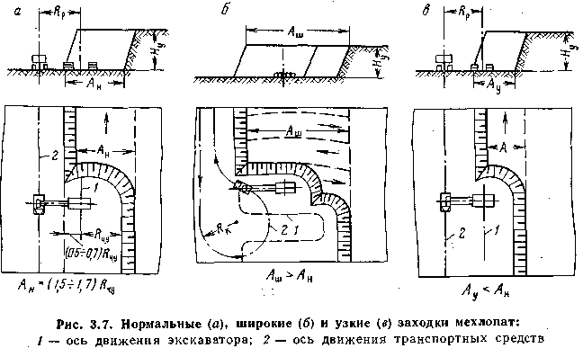 Карьерные мехлопаты применяются при выемке пород преимущественно в торцовом забое. Торцовым забоем могут отрабатываться сквозная или тупиковая заходки (рис. 3.6). Сквозная заходка целесообразнее, так как позволяет повысить производительность мехлопат и применить сквозные схемы движения транспорта.
