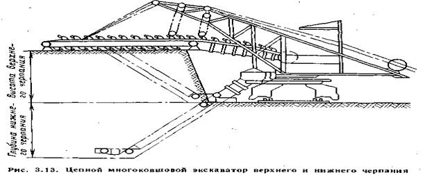 Многоковшовые цепные экскаваторы выпускаются с верхним или нижним черпанием (рис. 3.13).