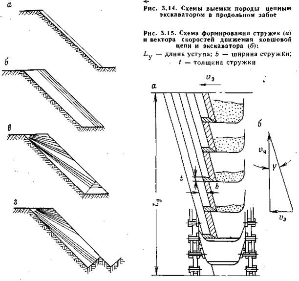В продольном забое выемка породы производится параллельными (рис. 3.14, а, б) или треугольными (рис. 3.14, в, г) стружками. Продольная стружка (ее толщина) образуется при движении ковшовой цепи по откосу уступа и при перемещении экскаватора вдоль уступа (рис. 3.15).