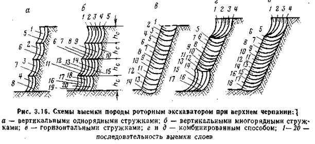 Выемка пород роторным экскаватором может производиться в торцовом и реже продольном забоях (например, при раздельной выемке) вертикальными (однорядными и многорядными) и горизонтальными стружками, а также комбинированными (рис. 3.16).