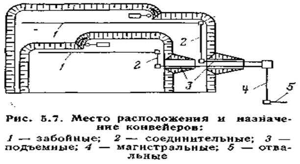 Конвейеры, предназначенные для транспортирования горной массы от забоев экскаваторов до приемных устройств отвалообразовательных машин, по своему назначению подразделяются на забойные, соединительные, подъемные, магистральные и отвальные (рис. 5.7.)