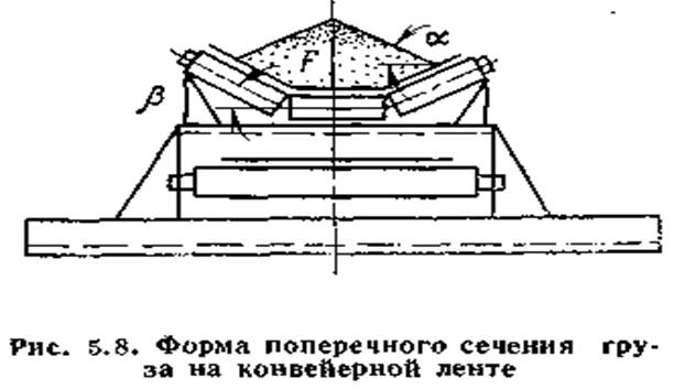Площадь поперечного сечения груза F (в м2) на ленте (рис. 5.8) зависит от формы (плоская, лотковая), углов наклона боковых роликов β и угла откоса насыпного груза α.