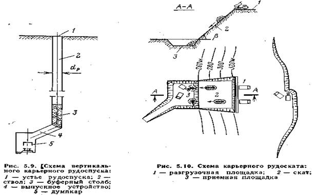 Рудоспуски (рис. 5.9) состоят из устья, ствола (вертикального или реже наклонного) и люковых выпускных устройств. Нижняя часть ствола одновременно является аккумулирующей емкостью, откуда руда грузится на смежный вид транспорта. В отдельных случаях для улучшения выпуска руды люки оборудуются вибрационными устройствами.