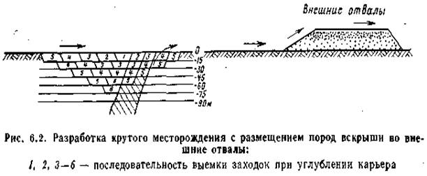В период строительства и наращивания производственной мощности карьеров на горизонтальных и пологих залежах возможно только внешнее отвалообразование.