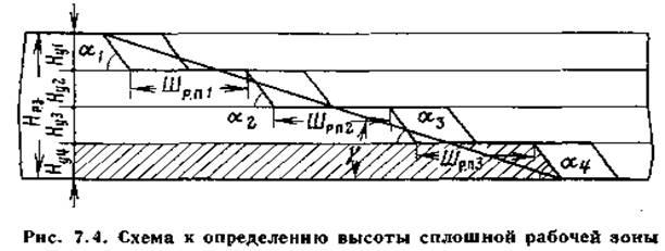 При разработке горизонтальных и пологих залежей рабочая зона по высоте изменяется незначительно. Такие рабочие зоны называют сплошными (рис. 7.4).