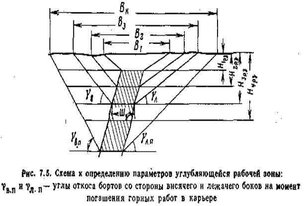 При разработке наклонных и крутых залежей размеры рабочей зоны изменяются как в плане, так и по высоте. Такие рабочие зоны называют углубляющимися (рис. 7.5).