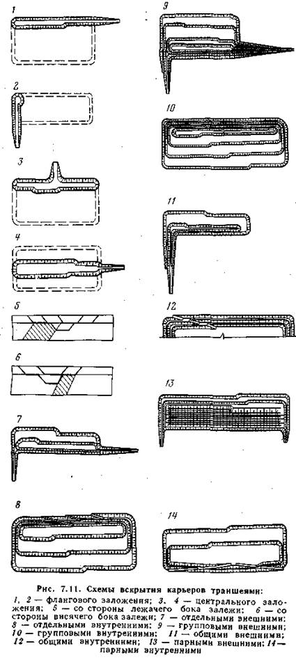 по расположению вскрывающих выработок относительно карьерного поля и залежи — фланговые, центральные, обеспечивающие вскрытие со стороны лежачего или висячего бока залежи или с торца карьера, а также внешние и внутренние;