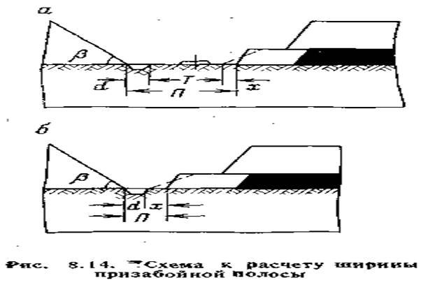 При тупиковом движении транспортных средств, по почве залежи полезного ископаемого размер призабойного пространства может устанавливаться как с учетом транспортной полосы, так и без нее. Учет транспортной полосы необходим при доставке полезного ископаемого железнодорожным или конвейерным транспортом (рис. 8.14, а). При автомобильной доставке маневр автосамосвалов может производиться в пределах заходки сзади добычного экскаватора, в связи с чем призабойное пространство может быть уменьшено (рис. 8.14, б).