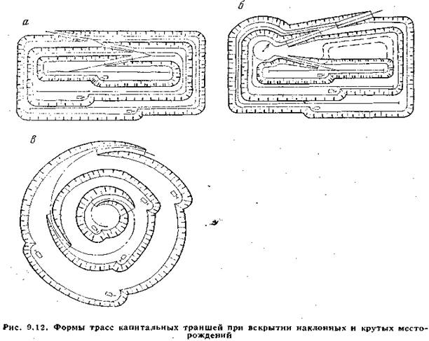 Выбор формы трассы капитальных траншей зависит от протяженности борта карьера, формы залежи полезного ископаемого в плане, вида применяемого транспорта, глубины карьера и т. д. В зависимости от срока их эксплуатации без переноса в новое положение трассы могут быть стационарными, полустационарными и скользящими.