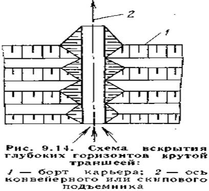 Крутыми траншеями (рис. 9.14) вскрывают, как правило, нижние горизонты глубоких карьеров, так как при этом обеспечиваются высокие темпы углубления горных работ (20 и более м/год) при ограниченных размерах дна карьера и резко сокращается расстояние транспортирования горной массы. Верхние горизонты глубоких карьеров отрабатываются, как правило, с применением колесных видов транспорта. Крутые траншеи оборудуются в устойчивых породах, обеспечивающих длительный срок их эксплуатации.