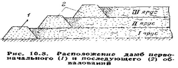 С увеличением высоты гидроотвала сооружаются дамбы последующего обвалования, при этом дамба начального обвалования становится периферической частью упорной призмы (рис. 10.8).