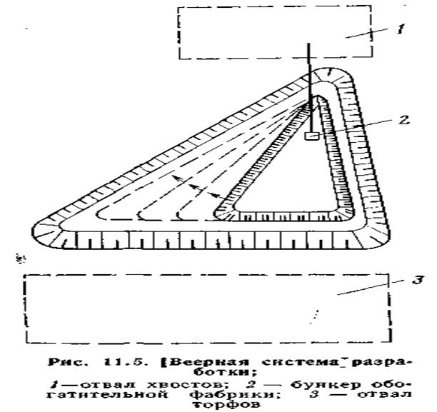 Наибольшее распространение при бульдозерной выемке получила веерная система разработки (рис. 11.5).