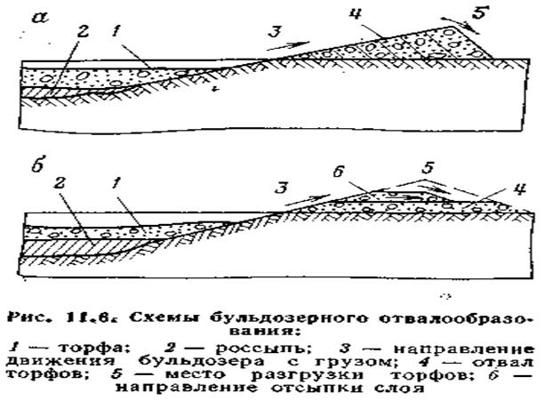 Различают схемы бульдозерного отвалообразования с наращиванием высоты отвала под постоянным углом (рис. 11.6, а) и с послойным отвалообразованием (рис. 11.6, б).