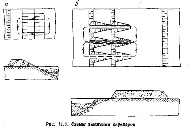 Технологические схемы разработки россыпей скреперами многообразны и отличаются друг от друга в первую очередь схемой движения скреперов. Критерием для выбора оптимального варианта является минимальное расстояние транспортирования. Выезд из карьера груженых и спуск в карьер порожних скреперов может осуществляться по выположенному борту (рис. 11.7, а) или по специально пройденным траншеям (рис. 11.7, б) при кольцевом движении (схема а) или при движении по спирали и по восьмерке (схема б). При двустороннем отвалообразовании для схем а и б движение будет соответственно челночным и кольцевым. Выезд из карьера устраивается под углом, обеспечивающим нормальное движение груженого скрепера.