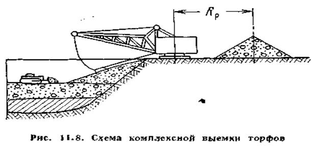 Бульдозеры, скреперы и экскаваторы в некоторых случаях используются комплексно. Наибольшее применение находит сочетание бульдозеров и экскаваторов (рис. 11.8) на полигонах шириной более 50 м и мощностью вскрыши до 6 м (бульдозеры — для послойной выемки, драглайны — для отвалообразования). При зимней выемке торфов на широких полигонах драглайны могут использоваться для выемки пород, а бульдозеры — для отвалообразования.