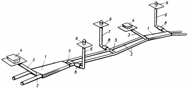 1 - Станция; 2- Перегонные тоннели; 3- Эскалаторные тоннели; 4- Наземные вестибюли; 5- Сбойки между тоннелями; 6,7- Стволы станционных и перегонных вентиляционных шахт соответственно; 8- Камеры с вентиляционными агрегатами; 9- Наземные киоски вентиляционных шахт.